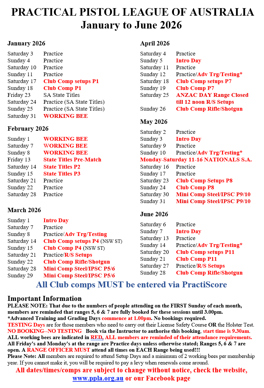 ALL dates are subject to change without notice. PLEASE DO NOT SEND MULTIPLE REQUESTS FOR THE SAME INTRO DAY. For those of you who try to book BEFORE 9.00am, your application will be ignored. It is an important point to remember that if you cannot follow the simple booking instructions, we would have concerns about you following the instructions on the safe use of firearms. Feel free to try again next month. Our club is NOT a commercial shooting range, please only book into our Intro Days if you are genuinely interested in taking up the pistol sports.